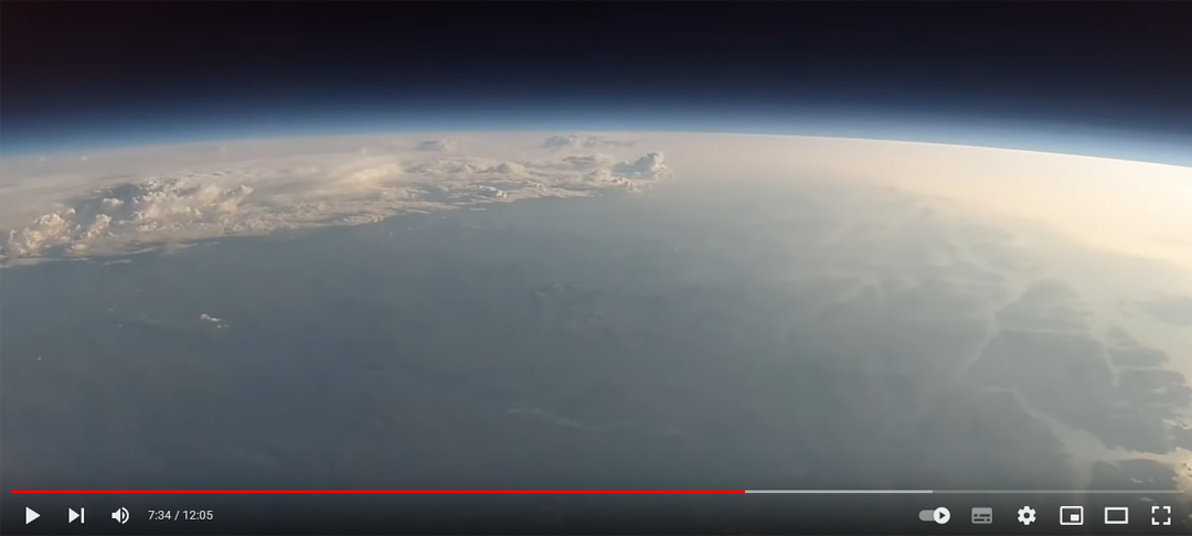 Da das Originalvideo (Near Space Weather Balloon Launch With Gopro To 109 000 Feet!) mit einer «GoPro Hero 3» (Fisheye Linse) gemacht wurde, wie aus der Beschreibung herauszulesen ist, kann man damit viele sinnvolle und auch sinnlose Snapshots machen. Der Snapshot (oben) wurde bei Minute 7:32 gemacht wo der Horizont leicht unter der Linsenmitte ist und somit wunderschön gerade aussieht. Es wird hier, zusammen mit dem Text, also impliziert, dass die Erde flach ist. Wenn ich dann 2 Sekunden später einen Snapshot mache, dann sieht das schon ganz anders aus: